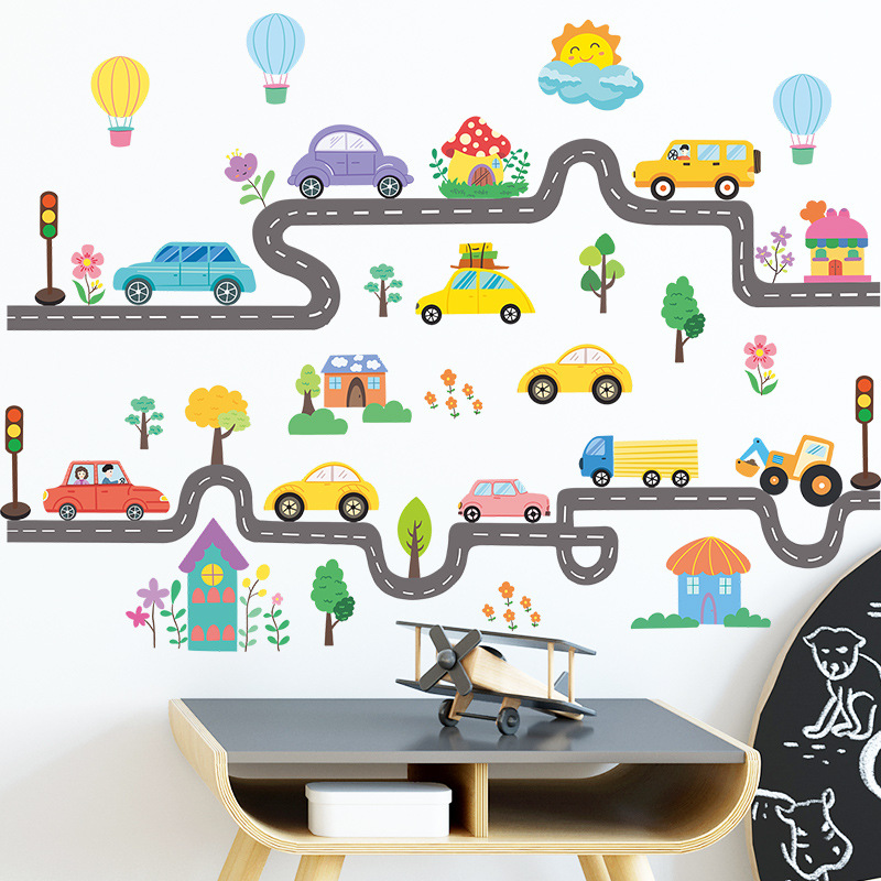 LD96146 kartun mobil jalanan balon udara panas pohon rumah kamar anak-anak dekorasi latar belakang stiker dinding perekat diri