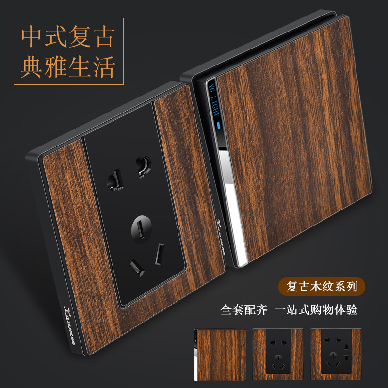 Xuanmeng panel soket sakelar serat kayu 86 tipe, colokan lima lubang tersembunyi satu terbuka untuk Hotel B & B retro gaya Tiongkok baru