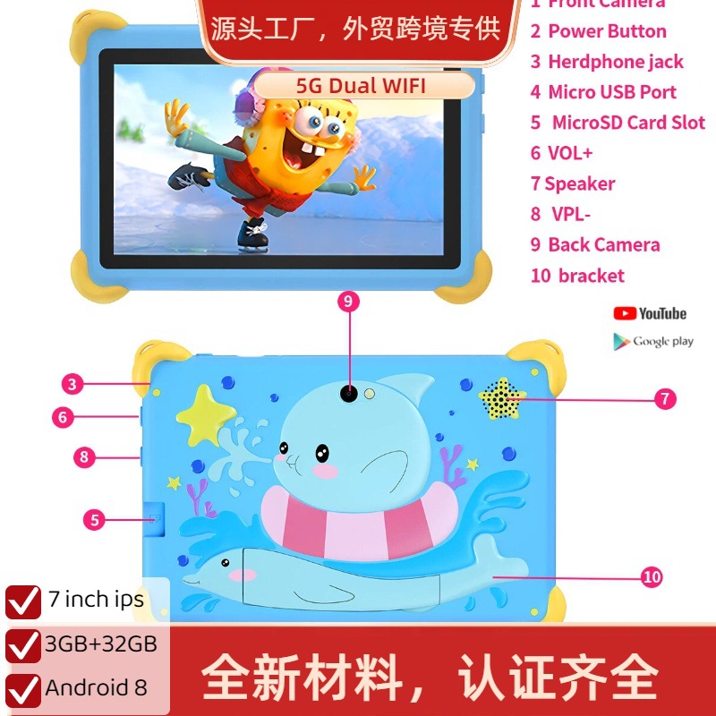Perdagangan luar negeri lintas batas 7 inci 2025 tablet pintar Android anak-anak anti-jatuh aplikasi pendidikan perlindungan visi yang kaya