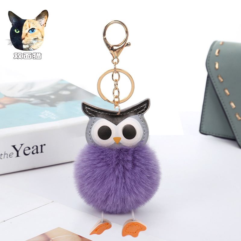 Gantungan kunci bola bulu burung hantu lucu liontin kartun kulit PU tas wanita ornamen mobil hadiah bola bulu