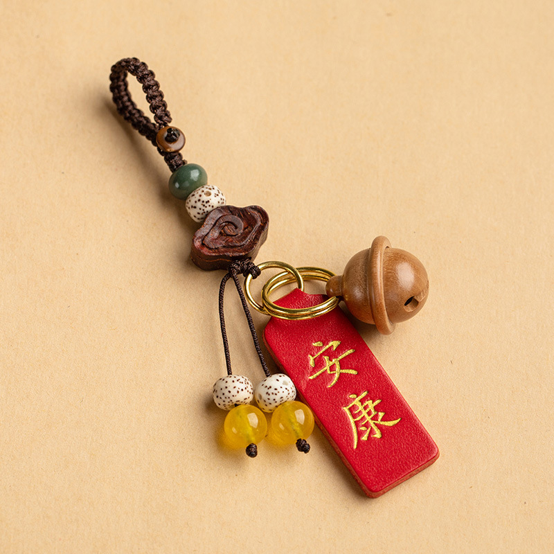 Ornamen tas pasangan pria dan wanita, gantungan kunci mobil bel kayu persik bermerek berkat kulit asli kreatif