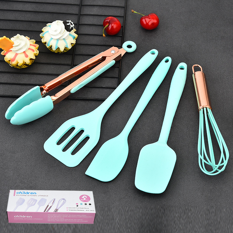 Pabrik grosir mini cross-border penuh silikon set peralatan dapur emas mawar menangani krim pengikis pengocok telur 5-piece set