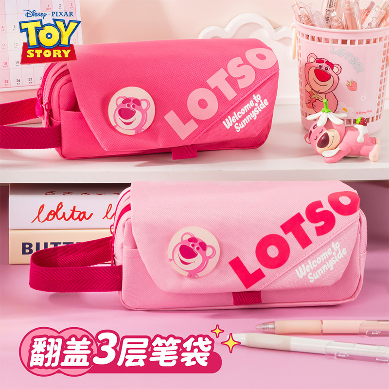 Disney Asli LOTSO Tempat Pensil Tiga Lapisan Penutup Beruang Strawberry Kotak Pensil Anak Perempuan Kapasitas Besar Tempat Pensil Anak Sekolah Dasar