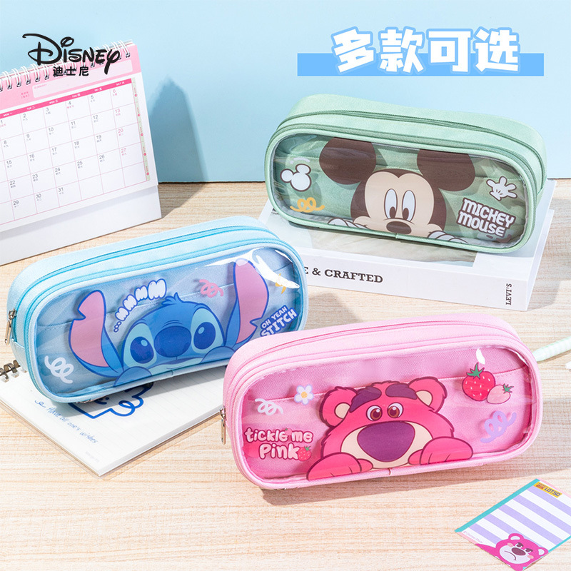 Kotak pensil kartun Disney, tas alat tulis transparan tahan noda kapasitas besar kelas tinggi pelajar sekolah dasar gaya ins