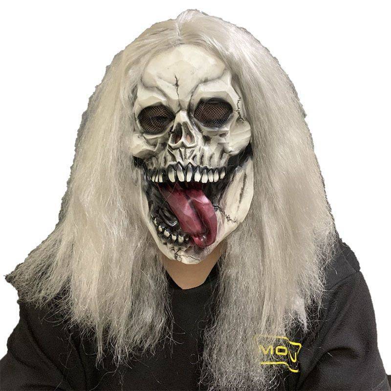 2025 Halloween Crossborder Hot Sale Haunted Room Escape NPC Prop Topeng Horor Rambut Perak Meludah Tengkorak