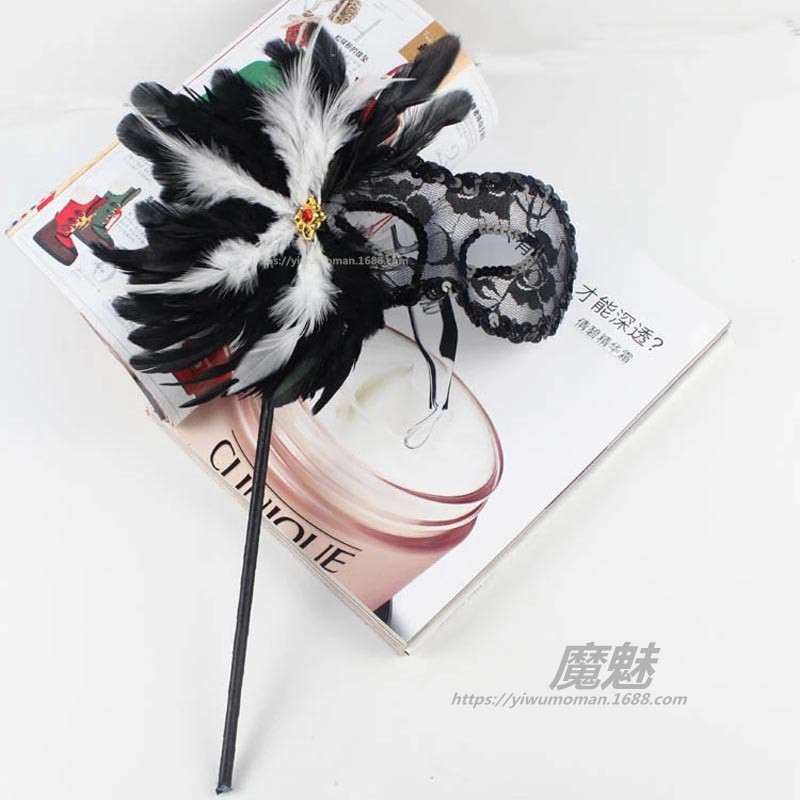 Masker tongkat Venetian buatan tangan wanita glitter kain kasa sisi bulu masker genggam tembus pandang