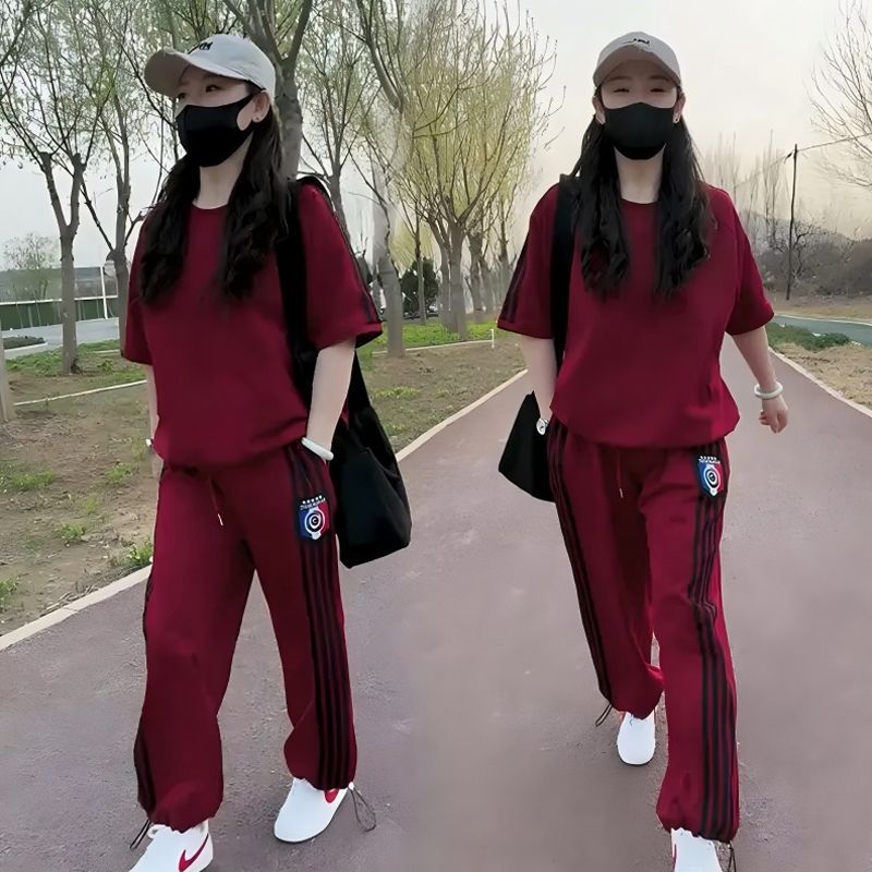 Set Dua Potong Modis Set T-shirt Lengan Pendek Kerah Bulat Kasual Mudah Dipadu Padan Terlihat Langsing Modis Longgar Model Baru Musim Panas 2025 Wanita