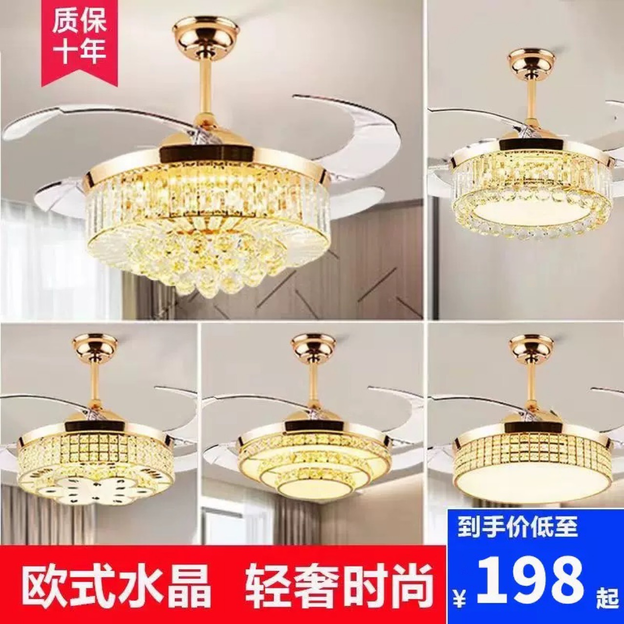 Lampu Kipas Tak Terlihat Kristal Gaya Eropa Lampu Kipas Gantung Terintegrasi 42 Inci di Kamar Tidur Ruang Makan Ruang Tamu Rumah Sederhana Modern