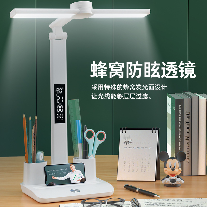 Jam meja tampilan digital, lampu meja lipat ukuran untuk siswa membaca Perlindungan Mata pemegang pena meja asrama membaca belajar membaca