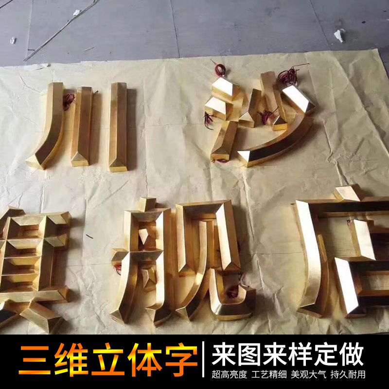 Pelat logam tiga dimensi kerajinan emas menyala kata stainless steel papan reklame gambar perusahaan tanda logam