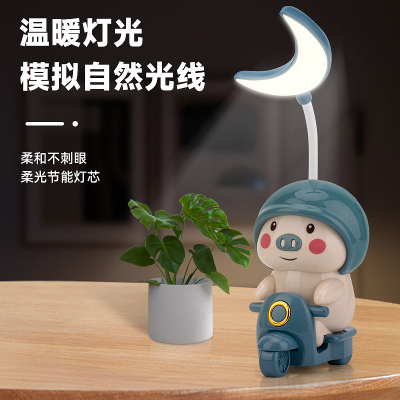 Lampu meja balon sepeda motor LED babi, lucu pelindung mata kartun hewan belajar membaca lampu malam rautan pensil hadiah untuk siswa