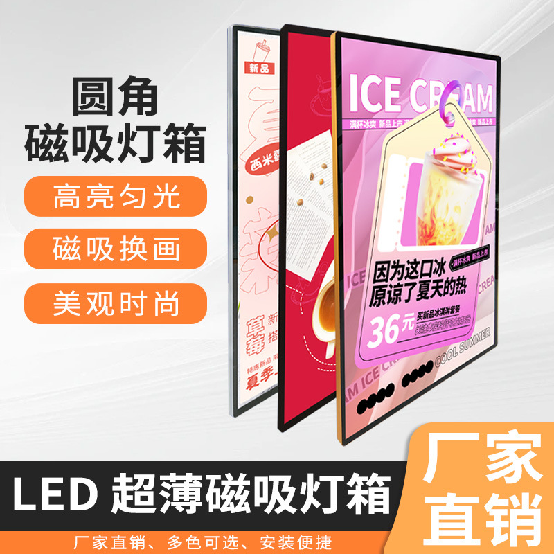Kotak lampu ultra-tipis akrilik, kotak lampu LED sudut bulat magnetik dari paduan aluminium, papan reklame kotak lampu untuk restoran dan toko teh susu