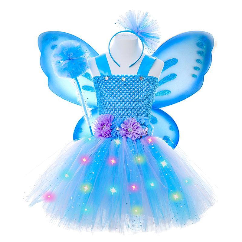 Gaun peri kupu-kupu pelangi rok tutu gaun kain kasa elf hutan berpayet pakaian pertunjukan anak perempuan gaun putri LED