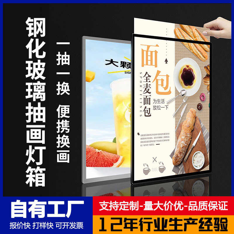 Kotak lampu gambar kaca Tempered led ultratipis papan reklame bercahaya bingkai poster logam campuran aluminium terpasang di dinding Tampilan berdiri