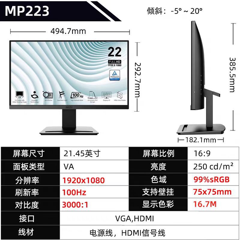 PRO MP223 21, 5 Inci 100Hz Anti Cahaya Biru Gantung Dinding Komputer Kantor Rumah Layar LCD VGA