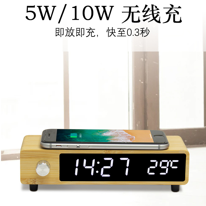 Jam alarm pengisian daya nirkabel, tombol kayu bambu baru, Jam alarm tampilan digital LED, jam elektronik kontrol suara kreatif