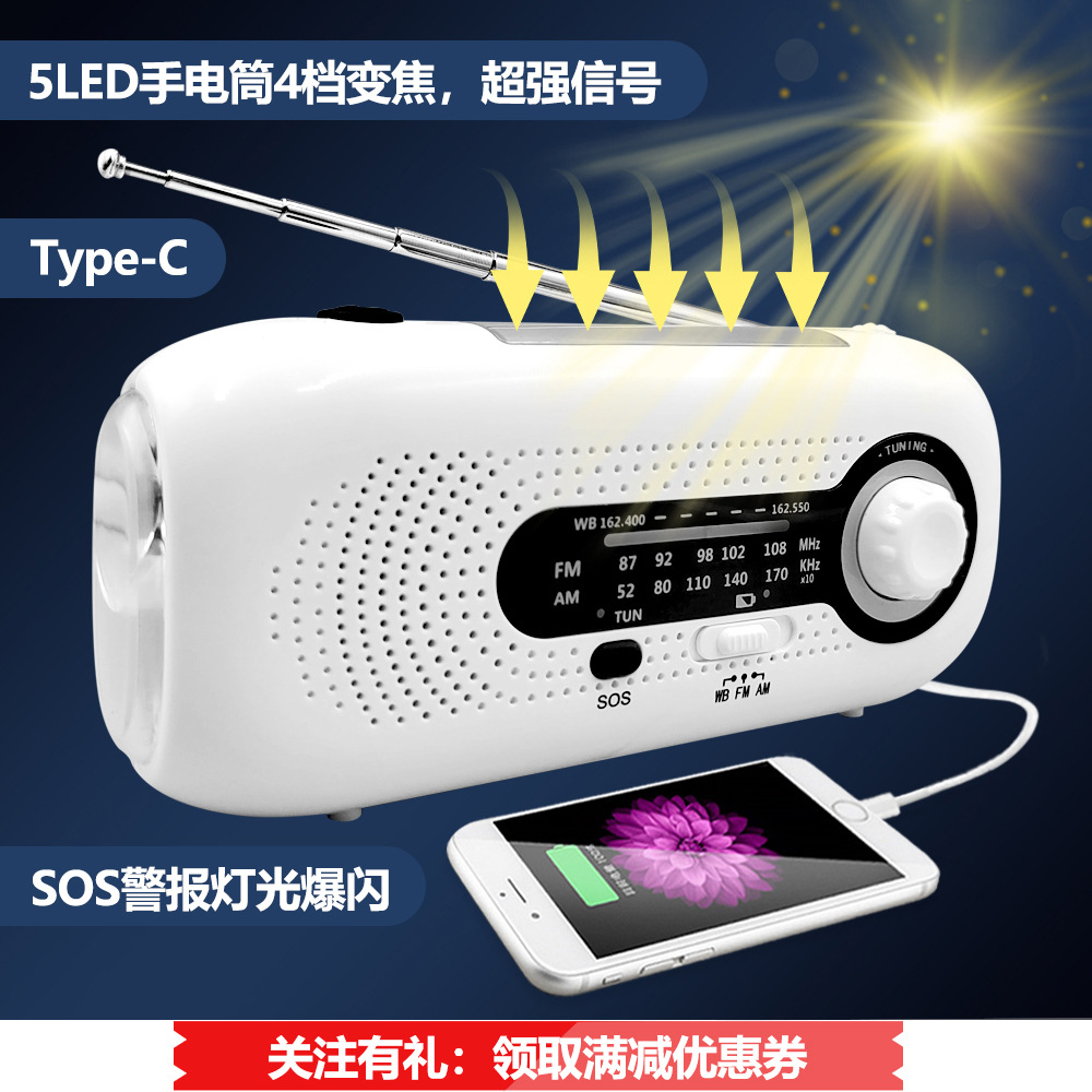 Senter tangan tenaga surya darurat Radio, senter 5LED 4 kecepatan zoom Tipe C luar ruangan SOS untuk bantuan