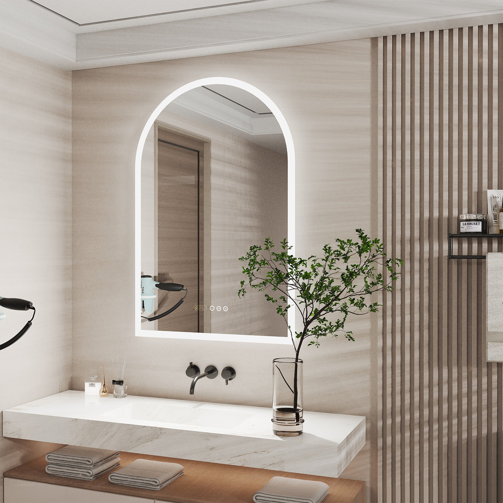 Cermin kamar mandi pintar renda bentuk khusus lampu LED layar sentuh anti-kabut cermin toilet toilet rias terpasang di dinding cermin bulat