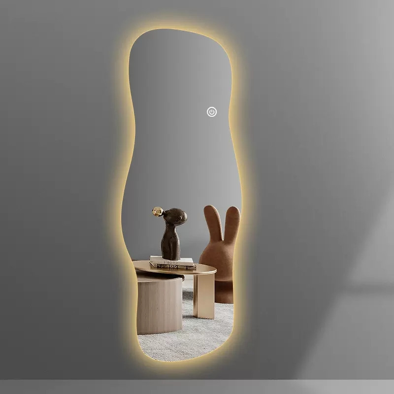 Cermin rias cerdas led tanpa bingkai, cermin layar sentuh tahan ledakan HD untuk rumah kamar tidur bentuk khusus