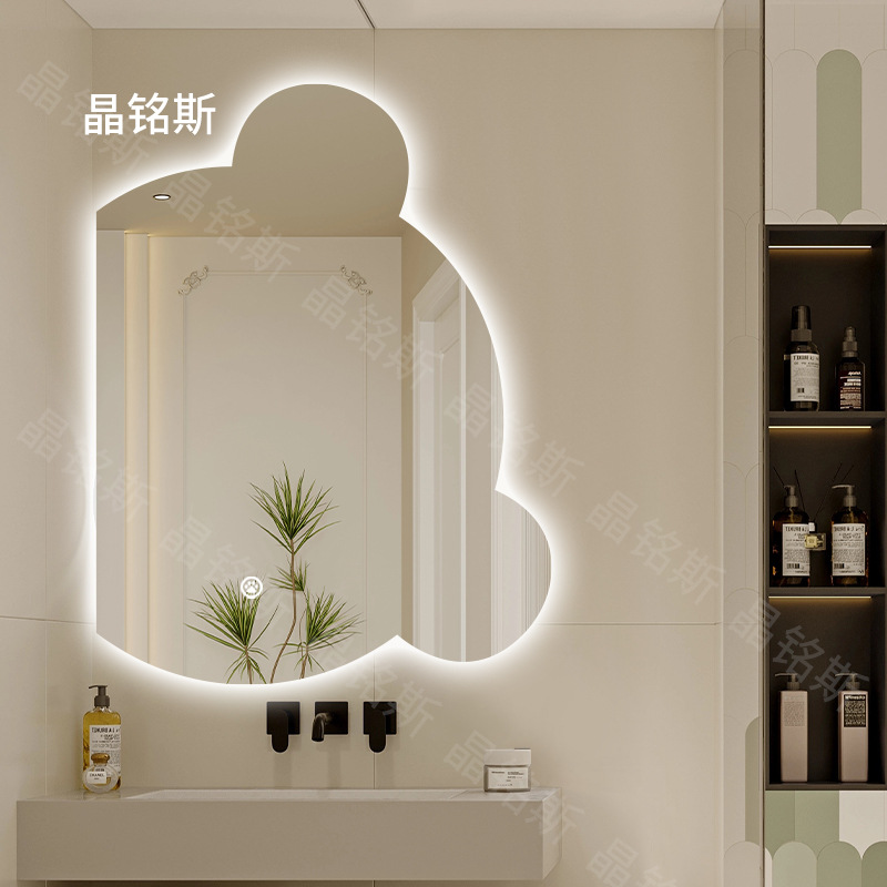 Cermin beruang kamar mandi pintar, cermin kamar mandi dengan lampu led layar sentuh induksi anti kabut bercahaya gantungan dinding