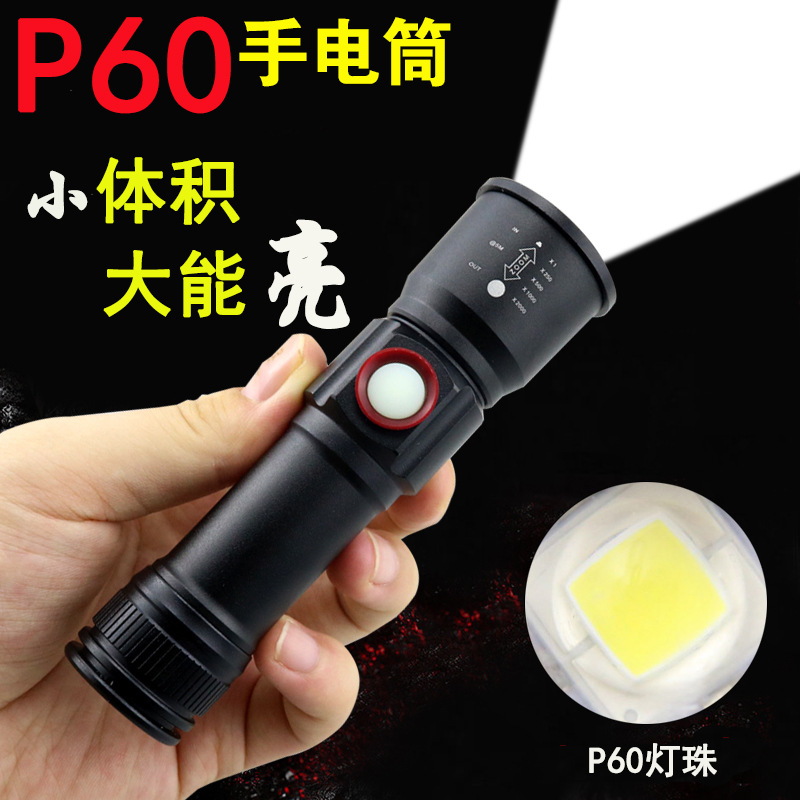 P60 senter mini USB lintas batas, baterai lithium isi ulang 18650 bawaan, lampu berkendara luar ruangan P50 baru