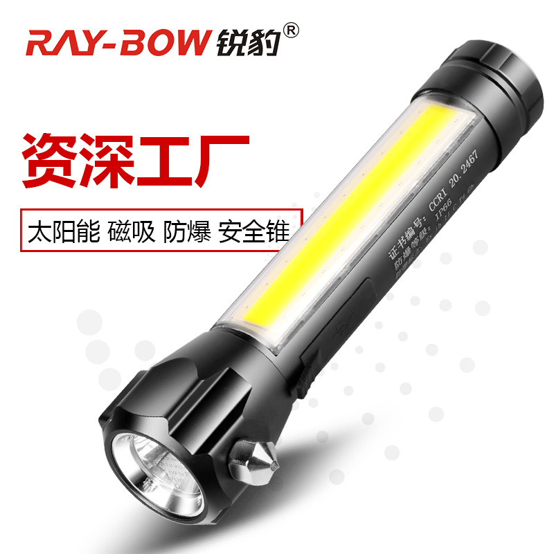 Senter multifungsi RuiBao dengan lampu kuat, dilengkapi magnet, tenaga surya, palu penyelamat darurat untuk mobil, senter survival untuk berkemah di luar ruangan.