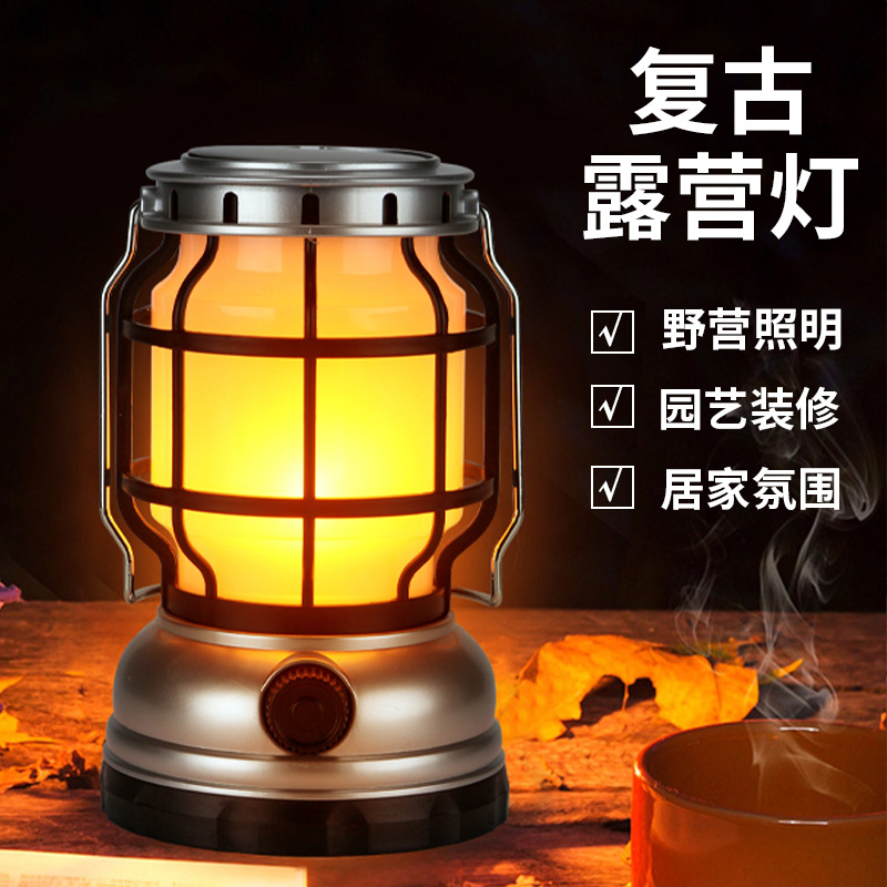 Lampu Kemah multifungsi, lampu berkemah kuat dan portabel lintas batas, lentera luar ruangan retro pengisian daya tenaga surya