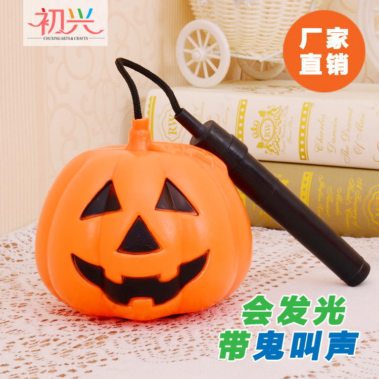 Halloween lentera labu pemancar cahaya lentera portabel anak-anak lentera berlubang dua sisi wajah tersenyum dengan alat peraga mainan suara