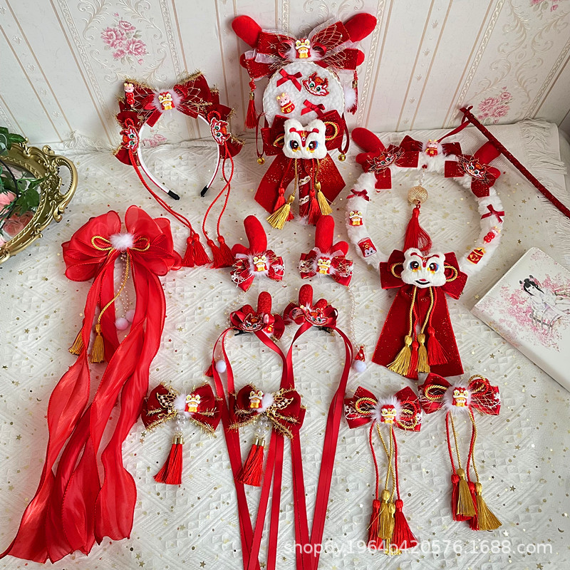 Aksesori rambut Lolita merah Tahun Naga 2024 buatan tangan aksesori rambut Hanfu tahun aksesori jepit rambut lampu portabel drum berderak