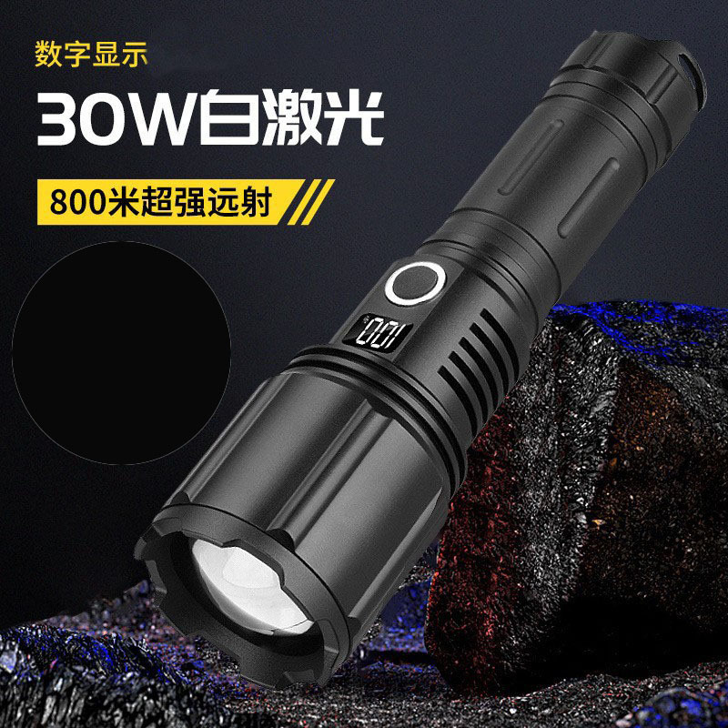 Senter jarak jauh luar ruangan lintas batas dengan tampilan digital yang dapat diisi ulang, strip fluoresen, palu ekor, zoom, dan laser putih, dapat diisi ulang.