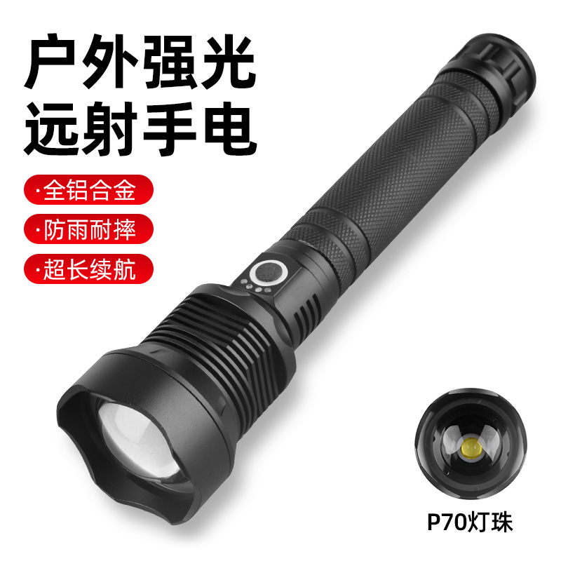 P70 senter luar ruangan teleskopik, cahaya kuat perbesaran TYPE-C paduan aluminium dengan tampilan daya jarak jauh dan cahaya kuat