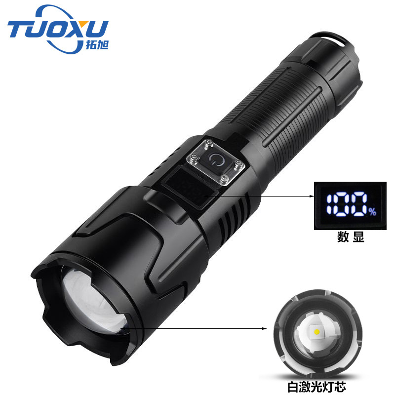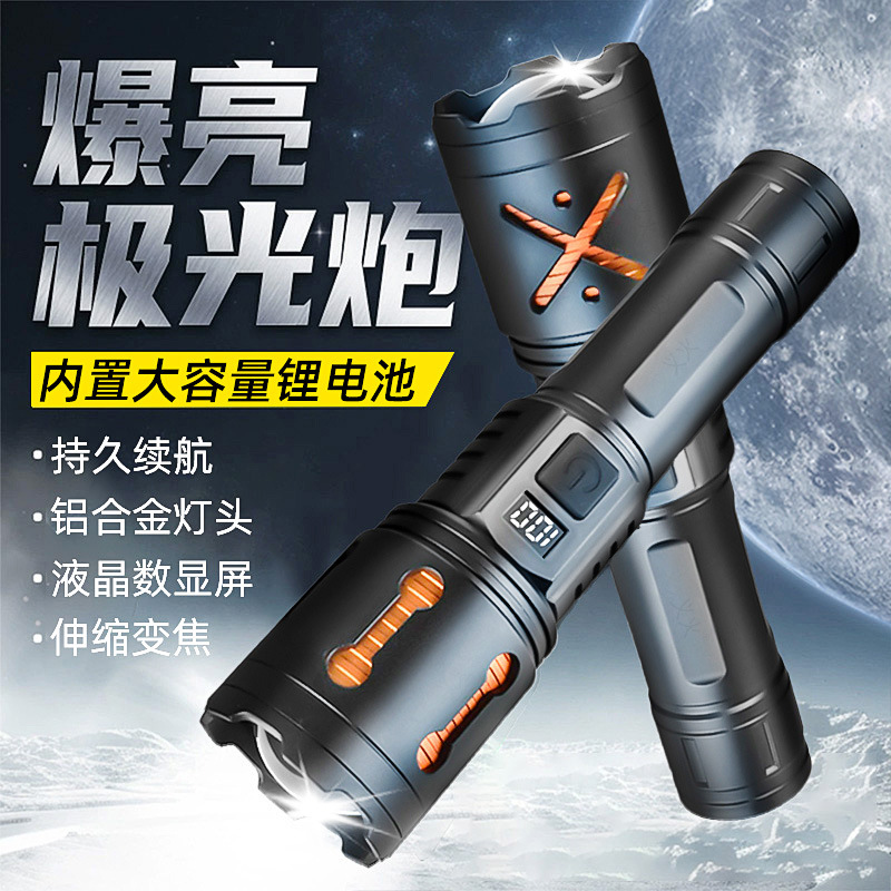 Senter P50 lintas batas, cahaya kuat display daya LED teleskopik zoom jarak jauh genggam pengisian daya USB cahaya kuat