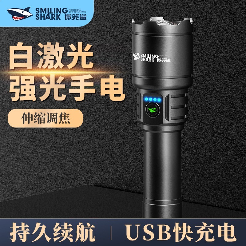微笑鲨新款户外照明强光远射变焦大功率充电持久续航铝合金手电筒