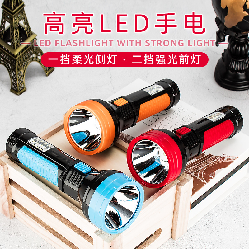 Suosen senter LED kuat portabel, lampu patroli darurat rumah tangga dapat diisi ulang dengan lampu samping, Senter besar