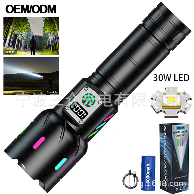 Senter laser Putih lintas batas, Senter LED jarak jauh zoom warna-warni layar isi ulang tipe-c