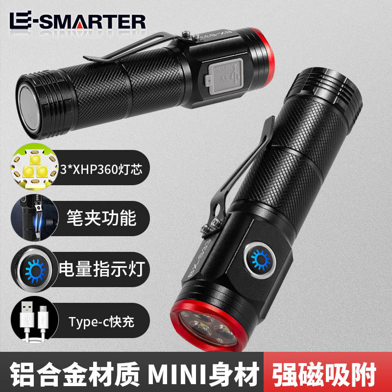 Senter mini tiga mata, lintas batas adsorpsi magnetik kuat bank daya darurat portabel pemegang pena multifungsi cahaya kuat senter kecil