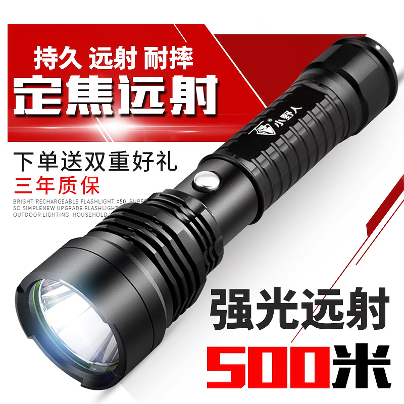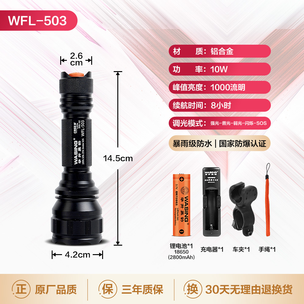 Huasheng senter hitam macan tutul 503, senter tahan ledakan barang asli lampu LED jarak jauh dapat diisi ulang patroli keamanan bekerja berkendara