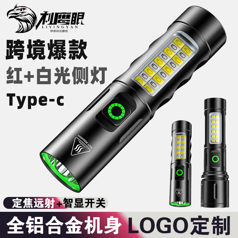 Tiktok senter kecil tiga mata, senter rumah tangga portabel kuat ringan baja, senter mini berkemah TYP-C