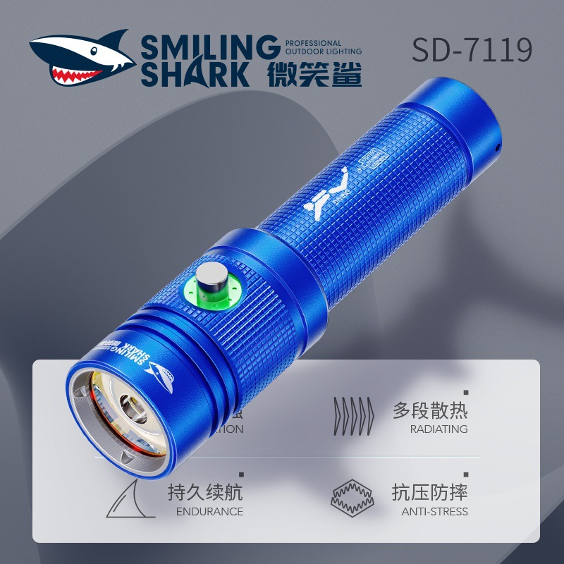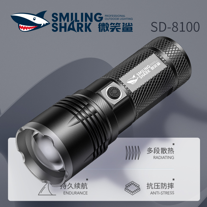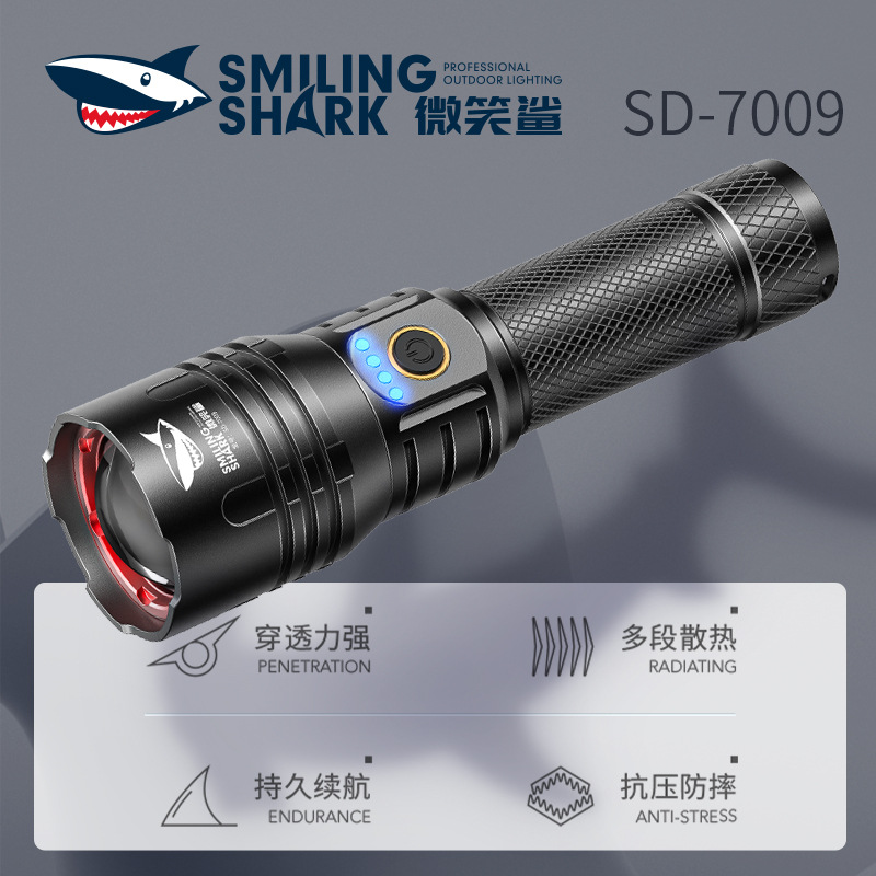Tersenyum hiu teleskopik zoom senter luar ruangan patroli lampu berkemah tampilan langsung multi-gear senter yang dapat disesuaikan