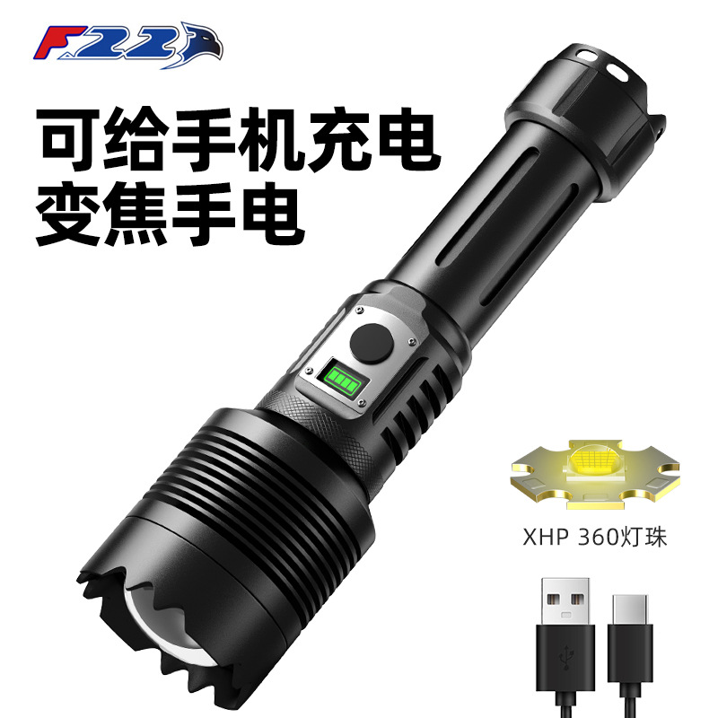 XHP360 senter cahaya kuat TYPE-C USB, senter jarak jauh tampilan daya digital 60W
