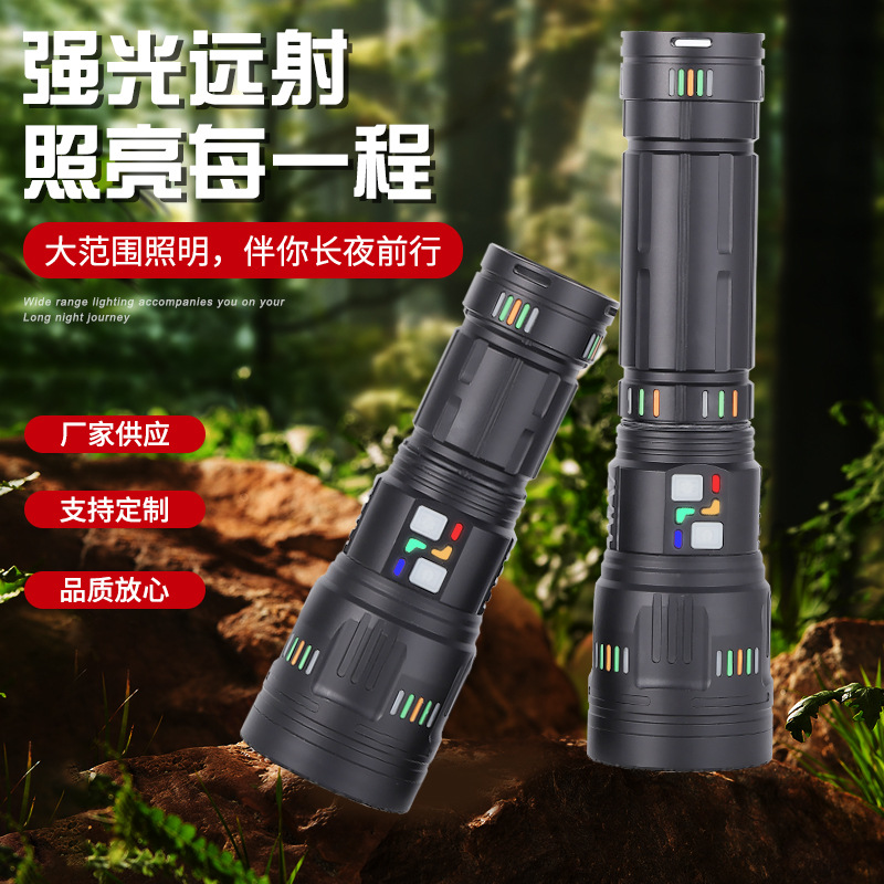 Senter luar ruangan warna berubah, cahaya kuat kendali jarak jauh Tipe C pengisian cepat ekor palu keamanan senter zoom teleskopik