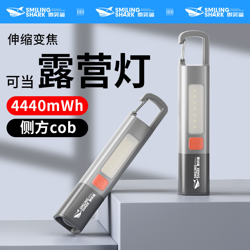 Lampu senter isi ulang daya berkendara hiking luar ruangan layar listrik fokus teleskopik cahaya kuat hiu senyum mikro