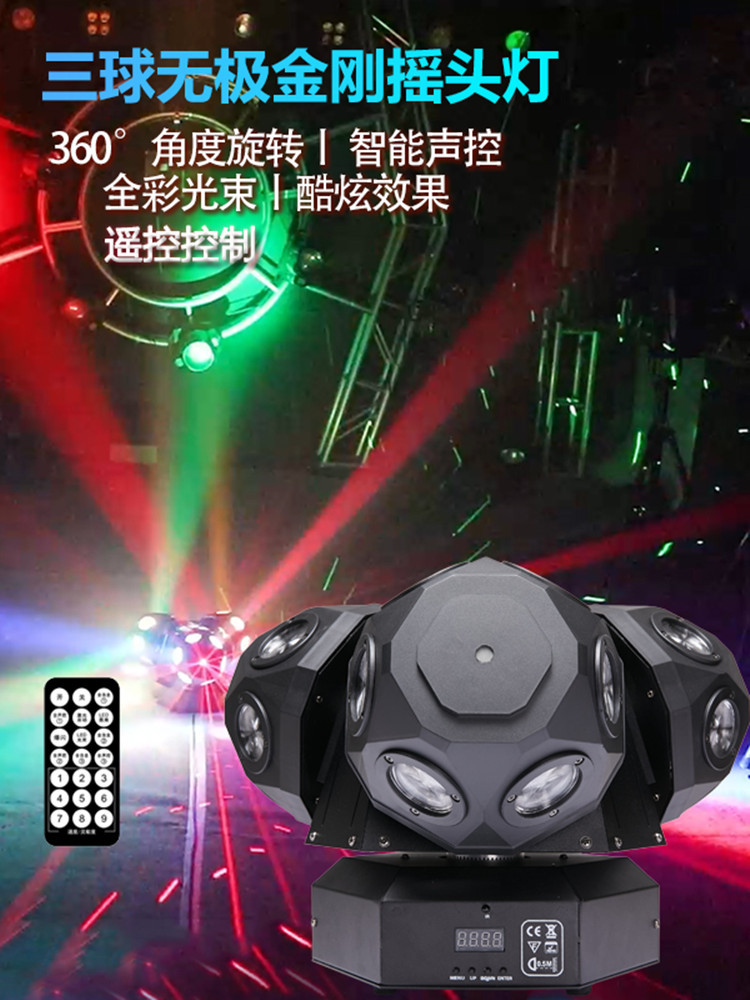 Lampu panggung tiga bola laser bergerak, cahaya kepala rumah tangga kendali jarak jauh ruang pribadi ktv bar warna penuh lampu kilat berputar