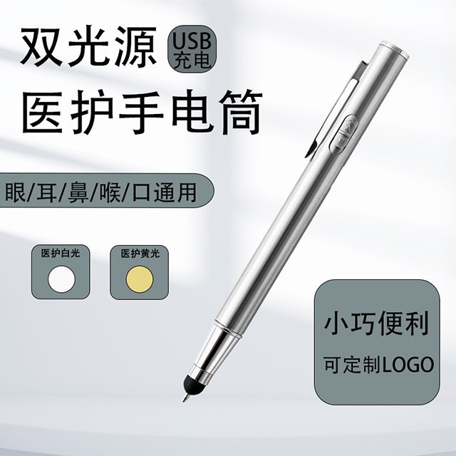 Pena Lampu Empat Gunakan Pena Stylus Pena Medis Pemeriksaan Telinga, Hidung dan Tenggorokan Lampu Senar Kecil Cahaya Ganda Kuning Putih
