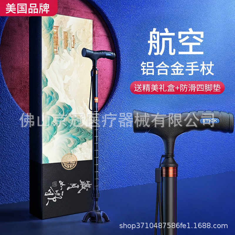 Alat bantu jalan khusus lansia UNQaid dari Amerika Serikat, tongkat empat kaki yang dapat ditarik, dilengkapi lampu, anti selip, dan portabel.