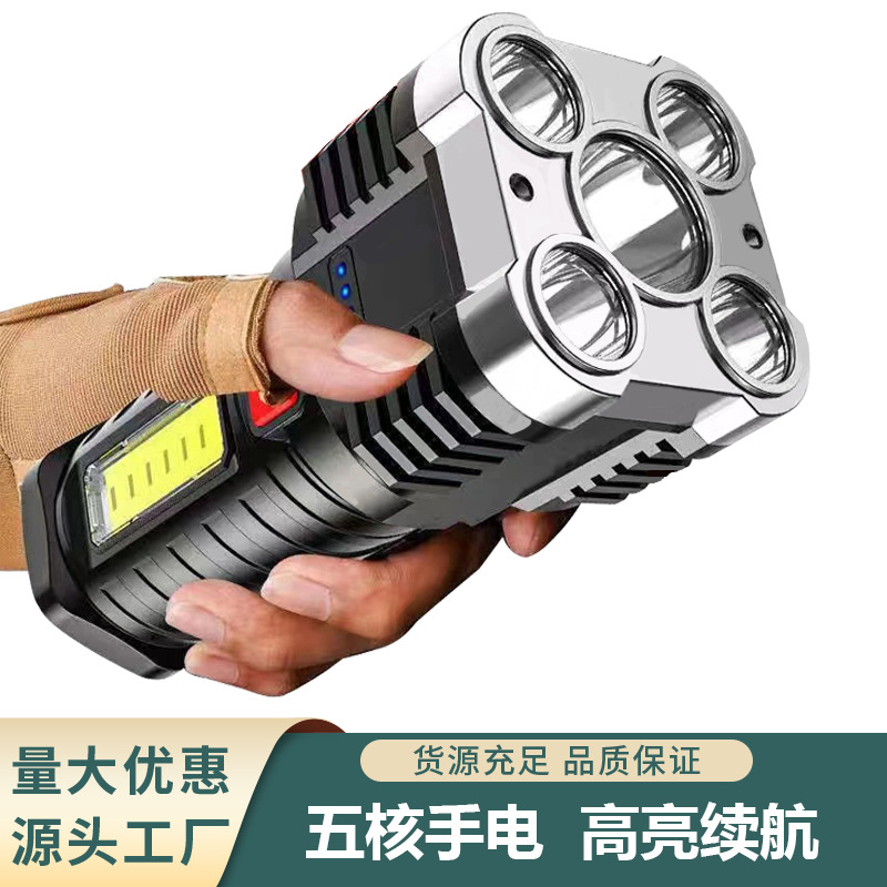 Senter multifungsi led lima inti, senter lintas batas luar ruangan USB dapat diisi ulang lampu samping cob, senter darurat rumah tangga kuat