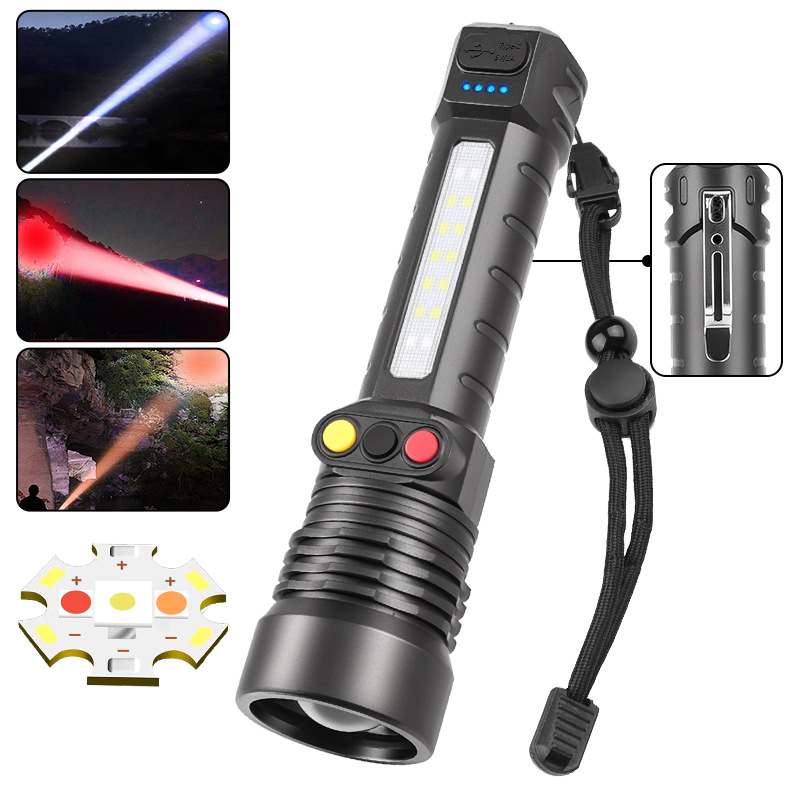 Lintas Batas Produk Baru Laser Putih LED Senter Multifungsi Tiga Warna Zoom Sisi Lampu Sinyal Pengisian Tipe-C