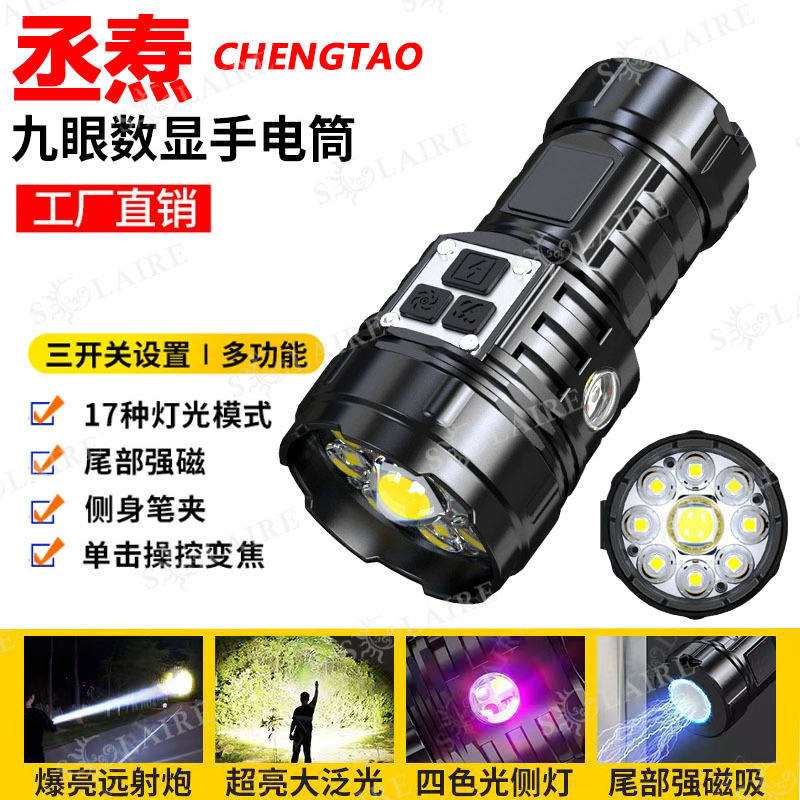 Tampilan Listrik Lintas Batas Luar Ruangan Luar Ruangan Cahaya Jauh Portabel Senter Multifungsi Laser Putih Pengisian Senter Cahaya Kuat