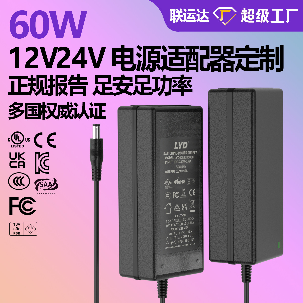 Adaptor daya 12V5A bersertifikasi ULclass2 KC 3C CE SAAPSE untuk lampu LED, catu daya 24V72W