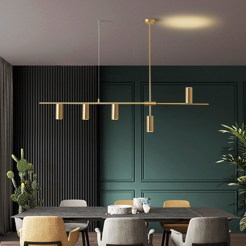 Lampu gantung kantor bergaya modern minimalis dengan desain sambungan lampu LED strip dan bar lilin untuk suasana ruang biliar.